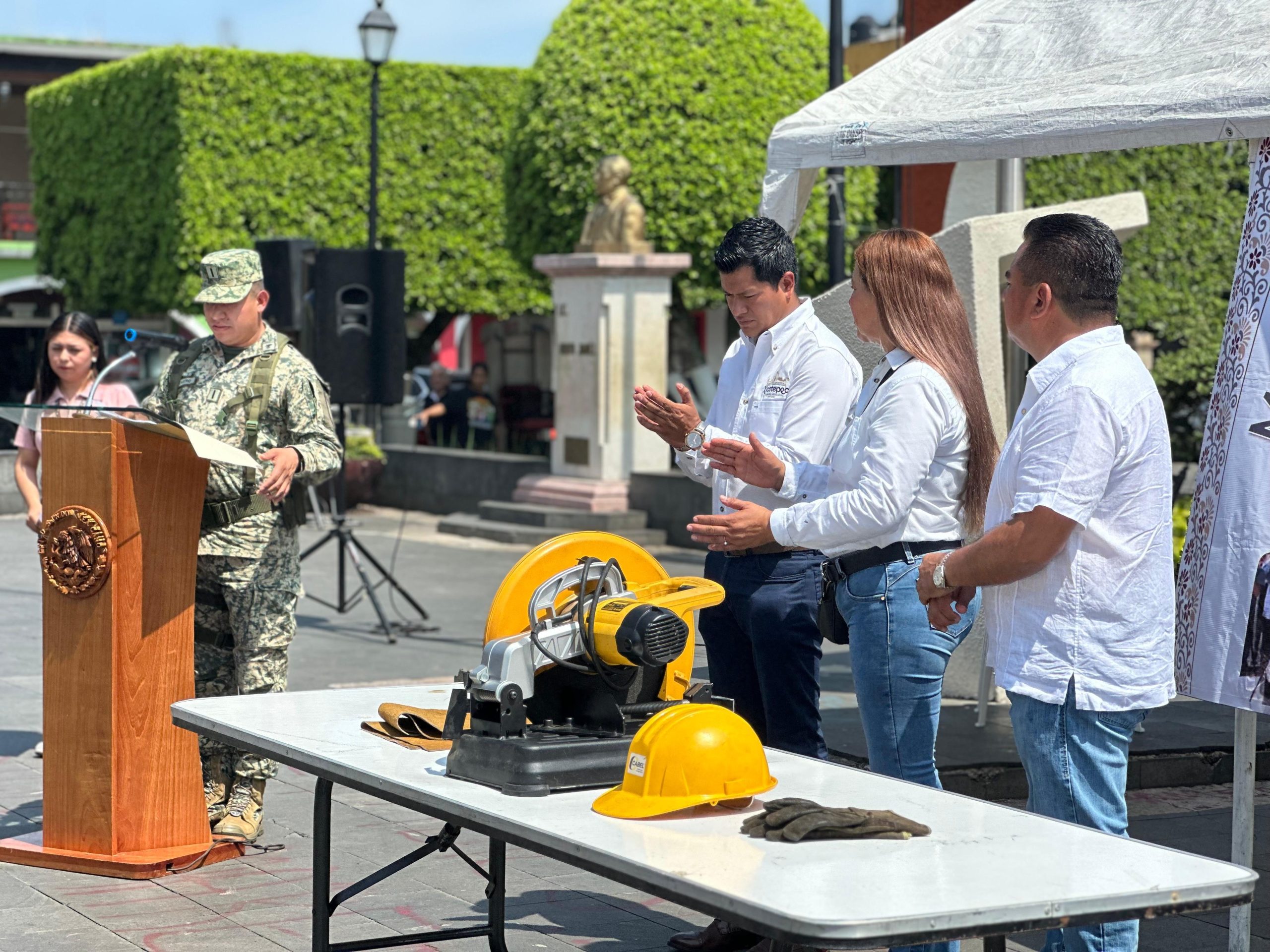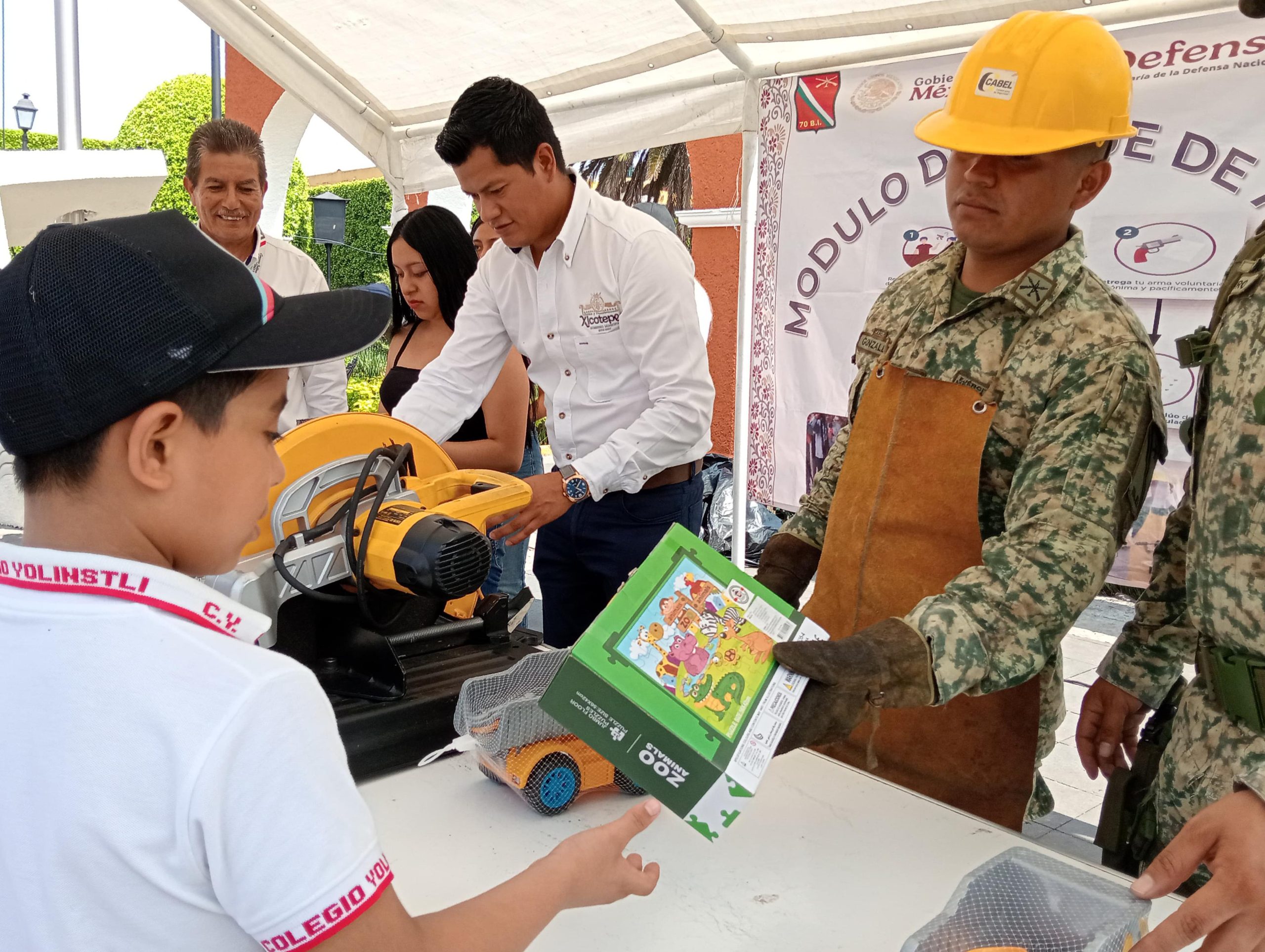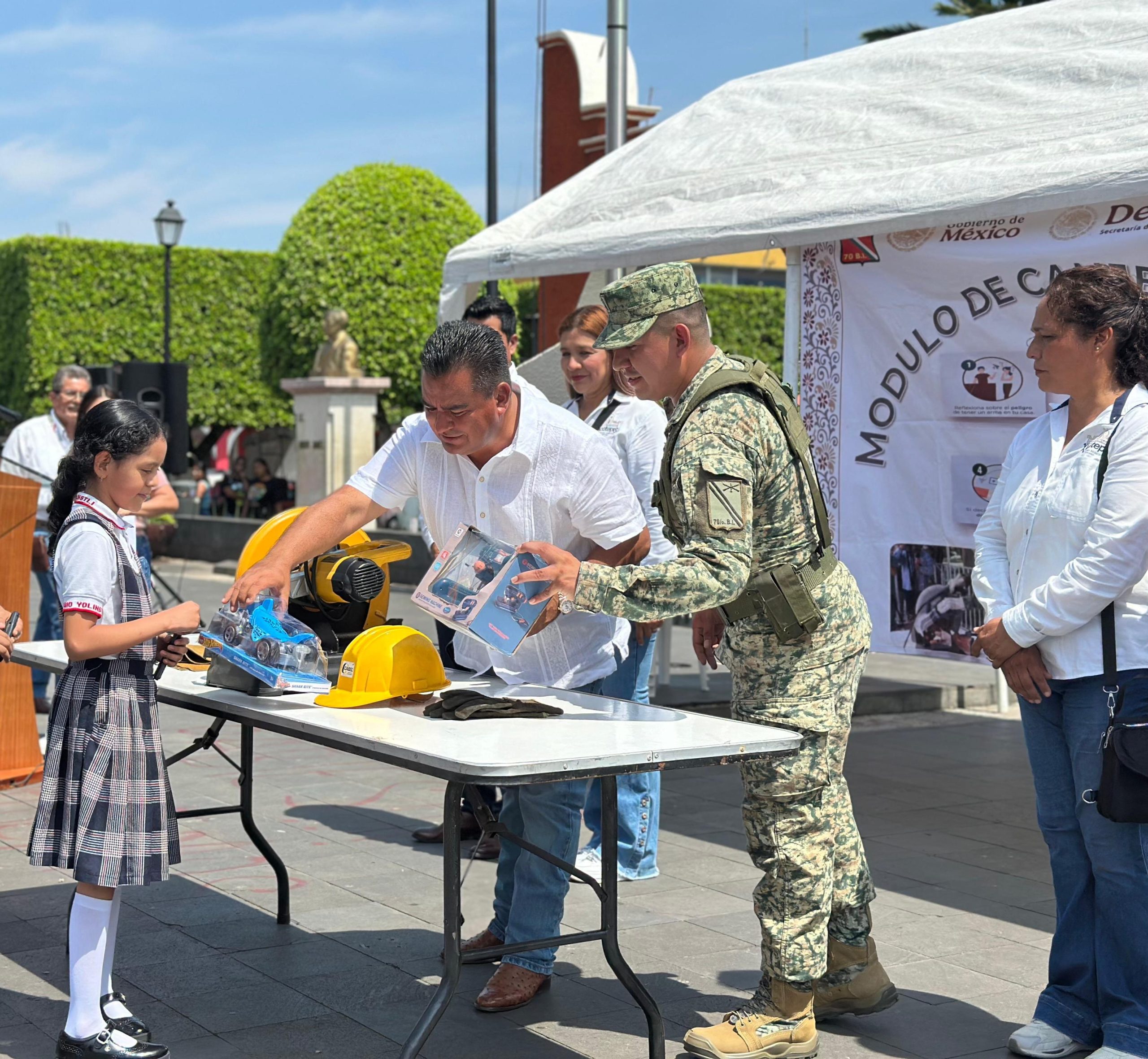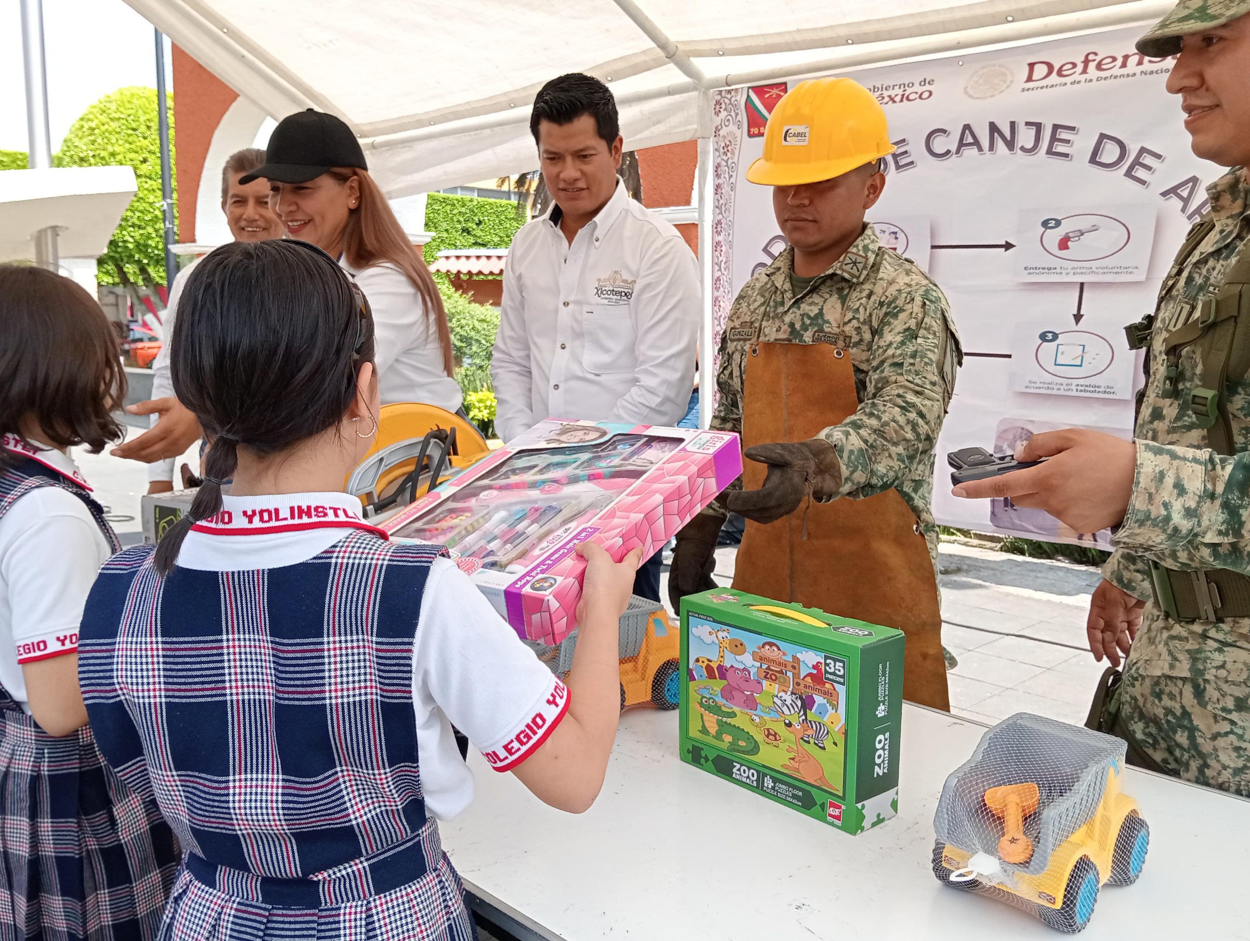 El arranque fue encabezado por el Presidente Carlos Barragán Amador y el Subteniente de Materiales de Guerra Christian Hernández Castro, con la participación de alumnos de cuarto grado de Primaria del Colegio “Yolinstli” a cargo de la Mtra. Lorena Silvia Peña, quienes canjearon juguetes bélicos por juguetes de convivencia sana y pacífica.