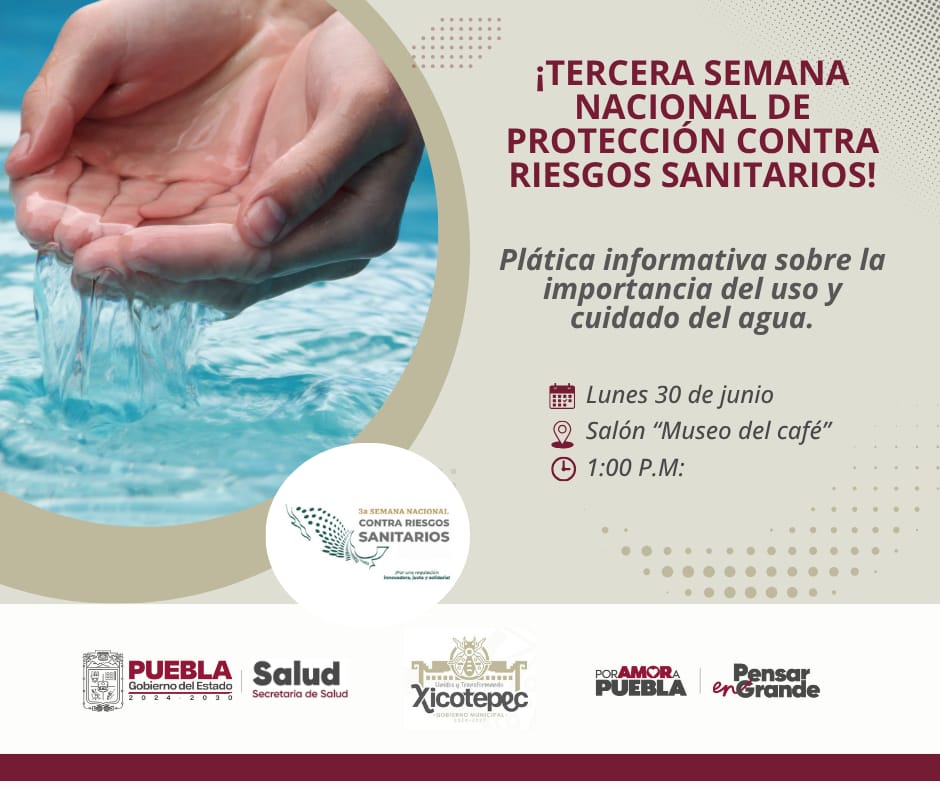 En el marco de la Tercera Semana Nacional de Protección contra Riesgos Sanitarios y a través de la Dirección de Salud, se llevó a cabo la plática informativa sobre la importancia del cuidado y el uso del agua dirigida a la población en general de Xicotepec.