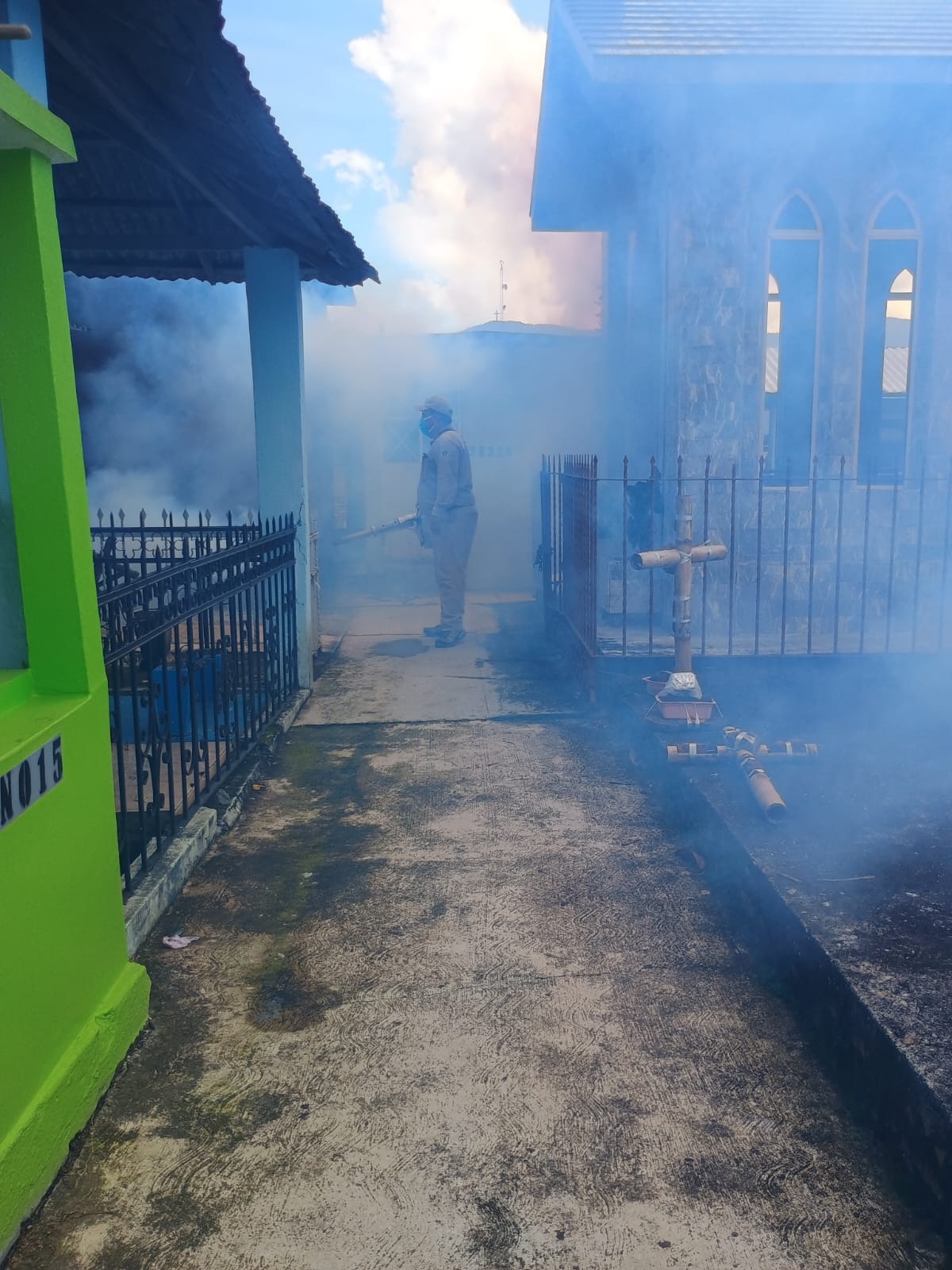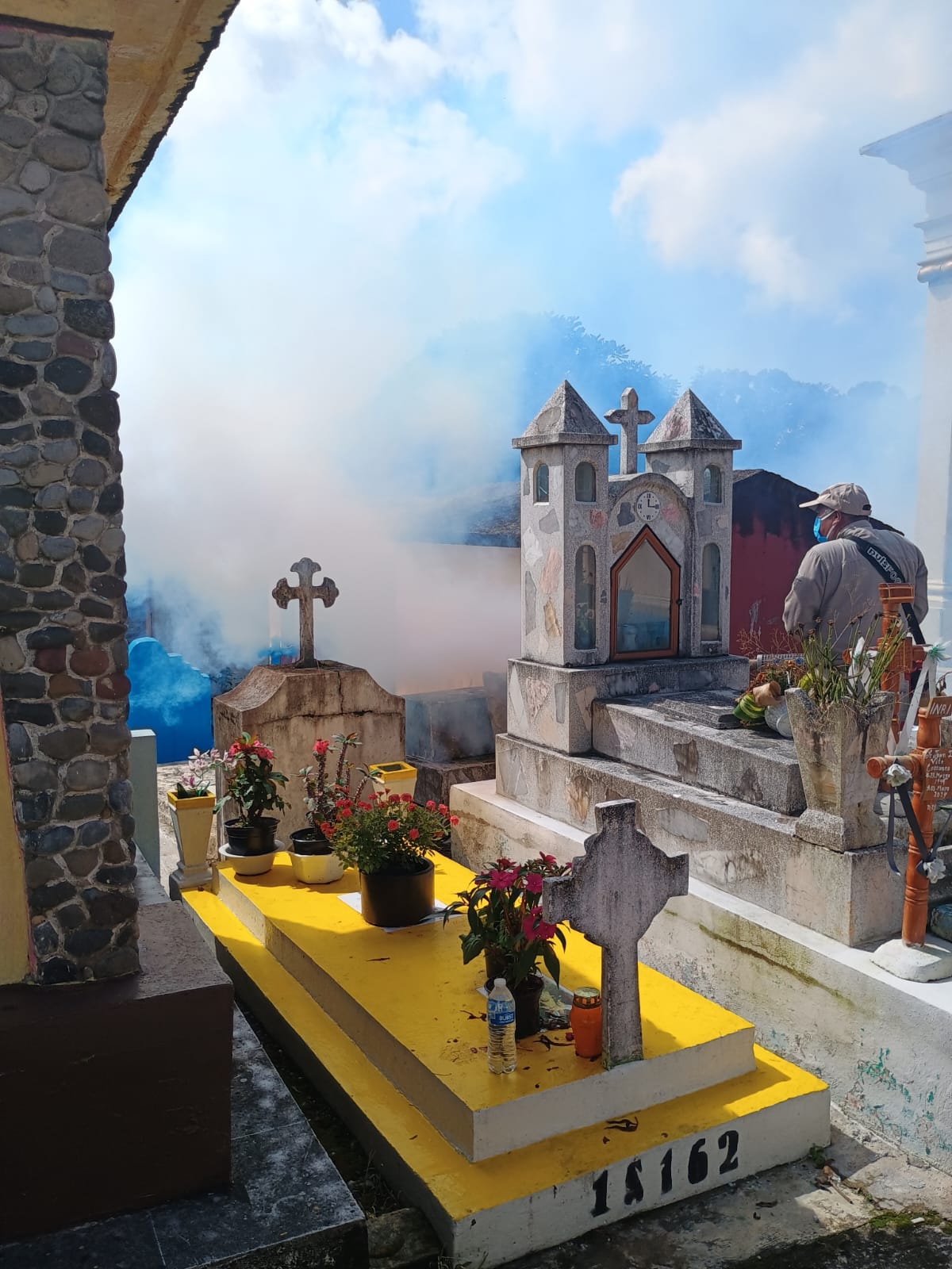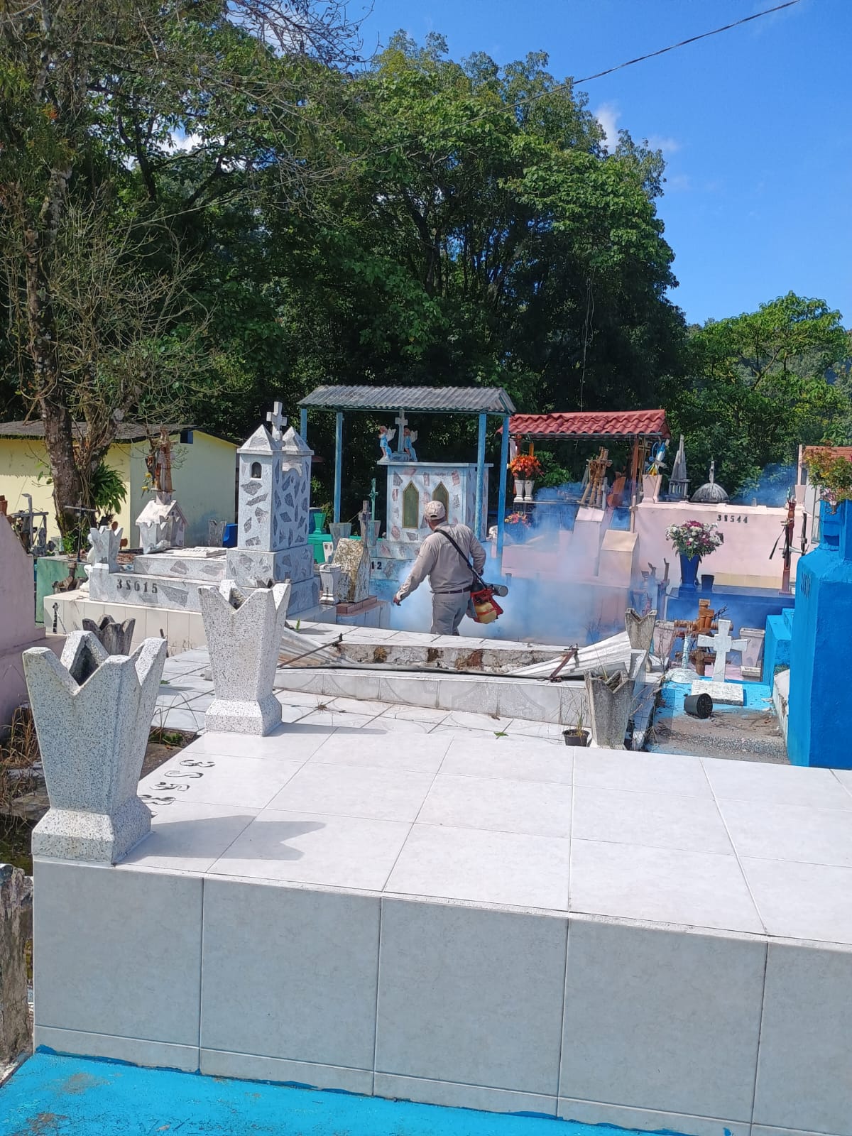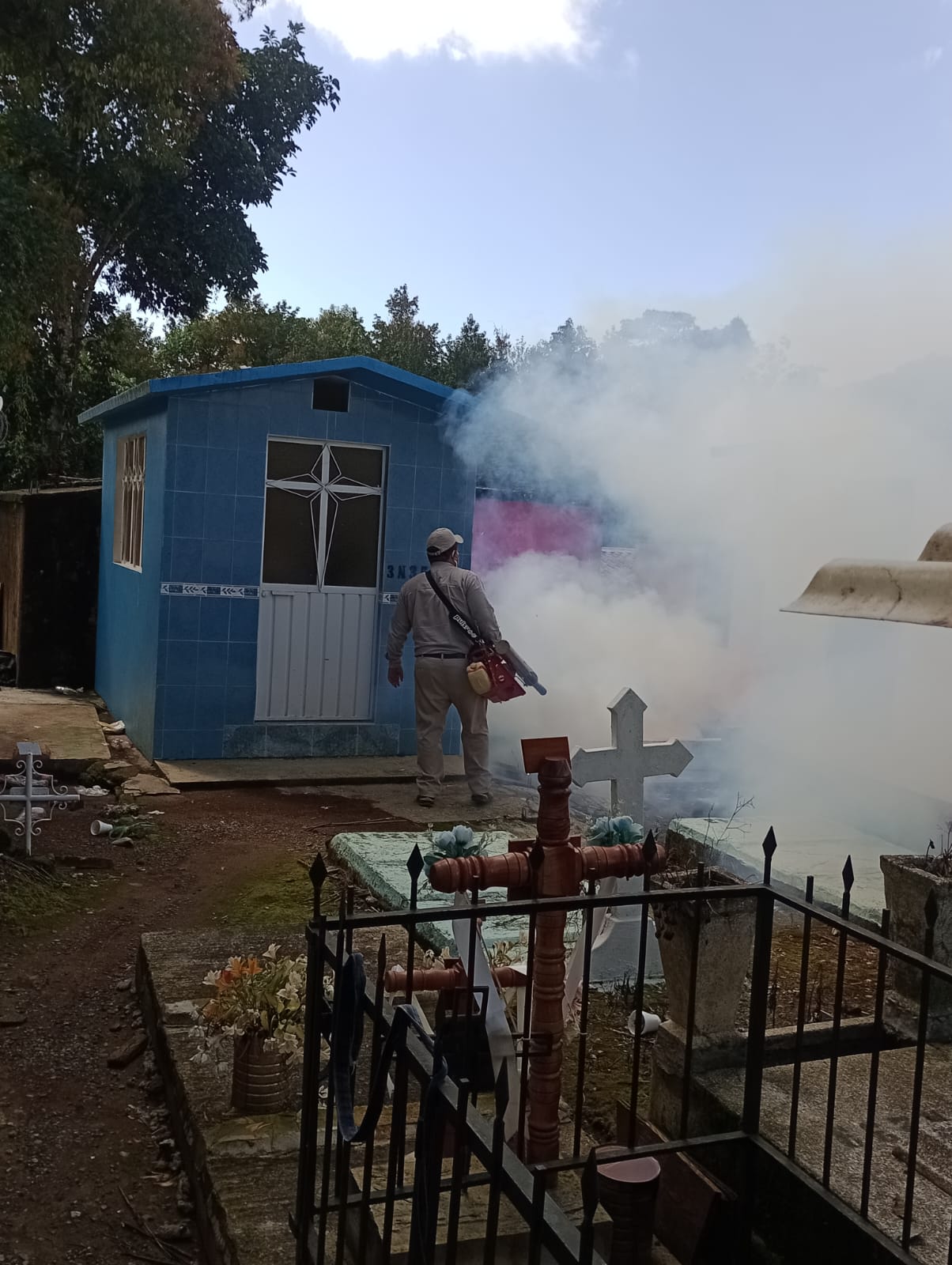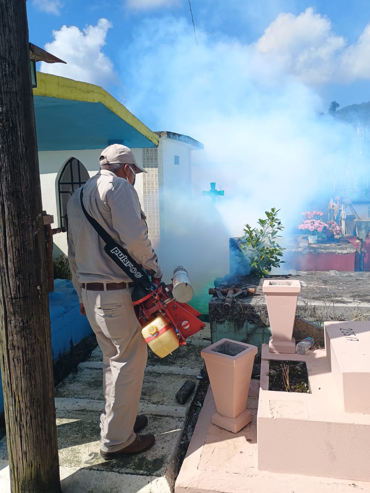 En el panteón municipal de Xicotepec, integrantes de Vectores de la Jurisdicción Sanitaria 01 Huauchinango de la Secretaría de Salud de Puebla llevaron a cabo labores de fumigación para evitar la reproducción del mosquito transmisor del dengue y proteger a la ciudadanía, derivado de la coordinación con la Dirección de Servicios Públicos Municipales.