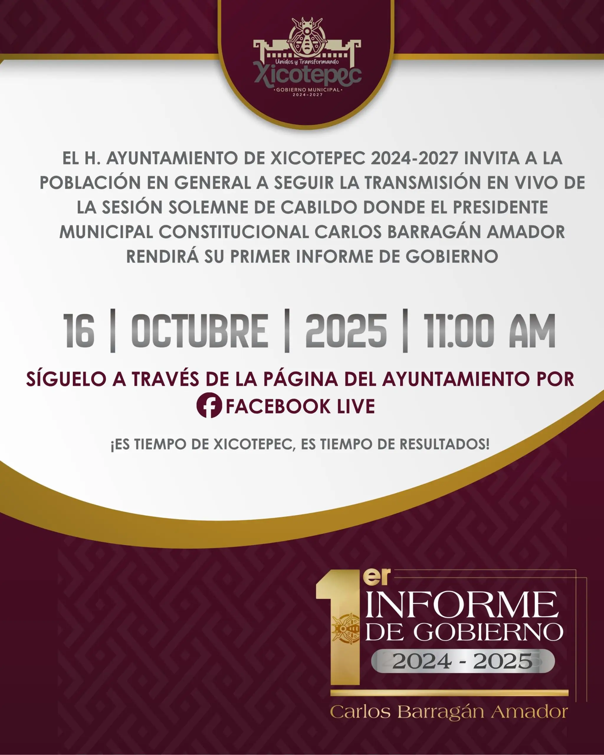 Te invitamos a ser parte del Primer Informe de Gobierno del Presidente Municipal Carlos Barragán Amador que emitirá de manera virtual a la ciudadanía de Xicotepec.