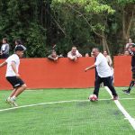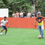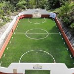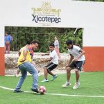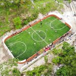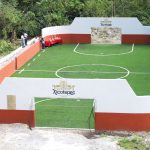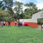 La cancha incluye porterías y pasto sintético, muro de contención, limpieza, trazado, excavaciones, balastre, compactación de terreno y muretes.