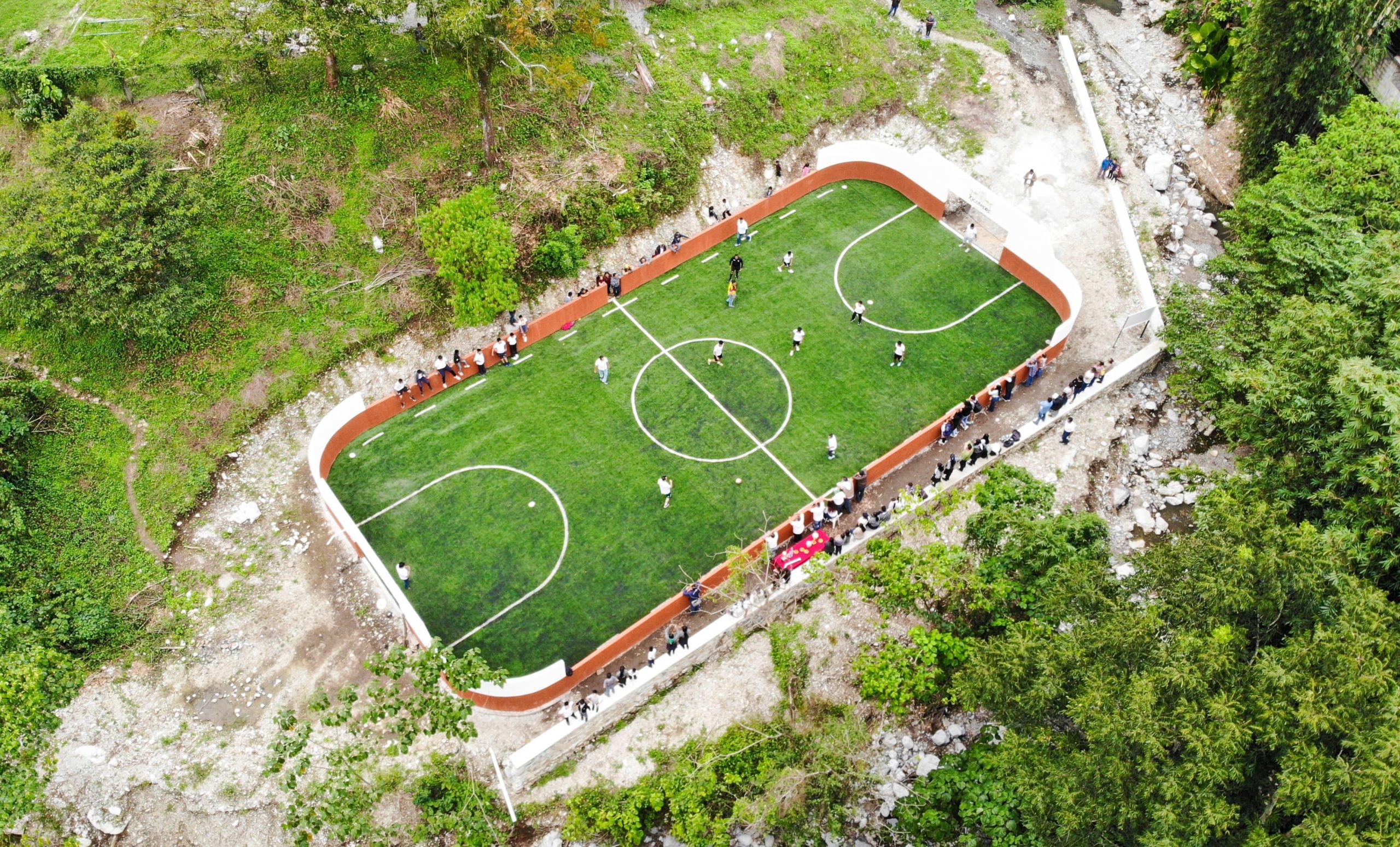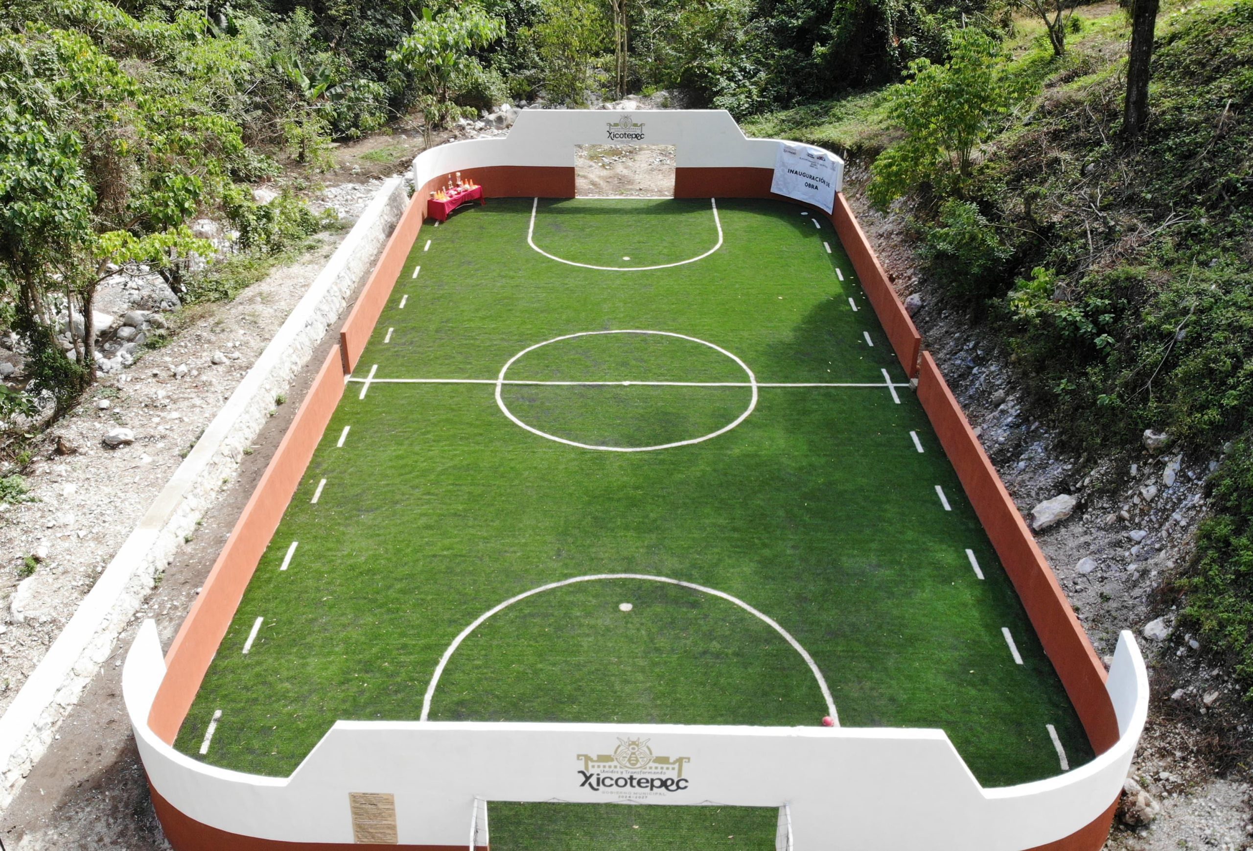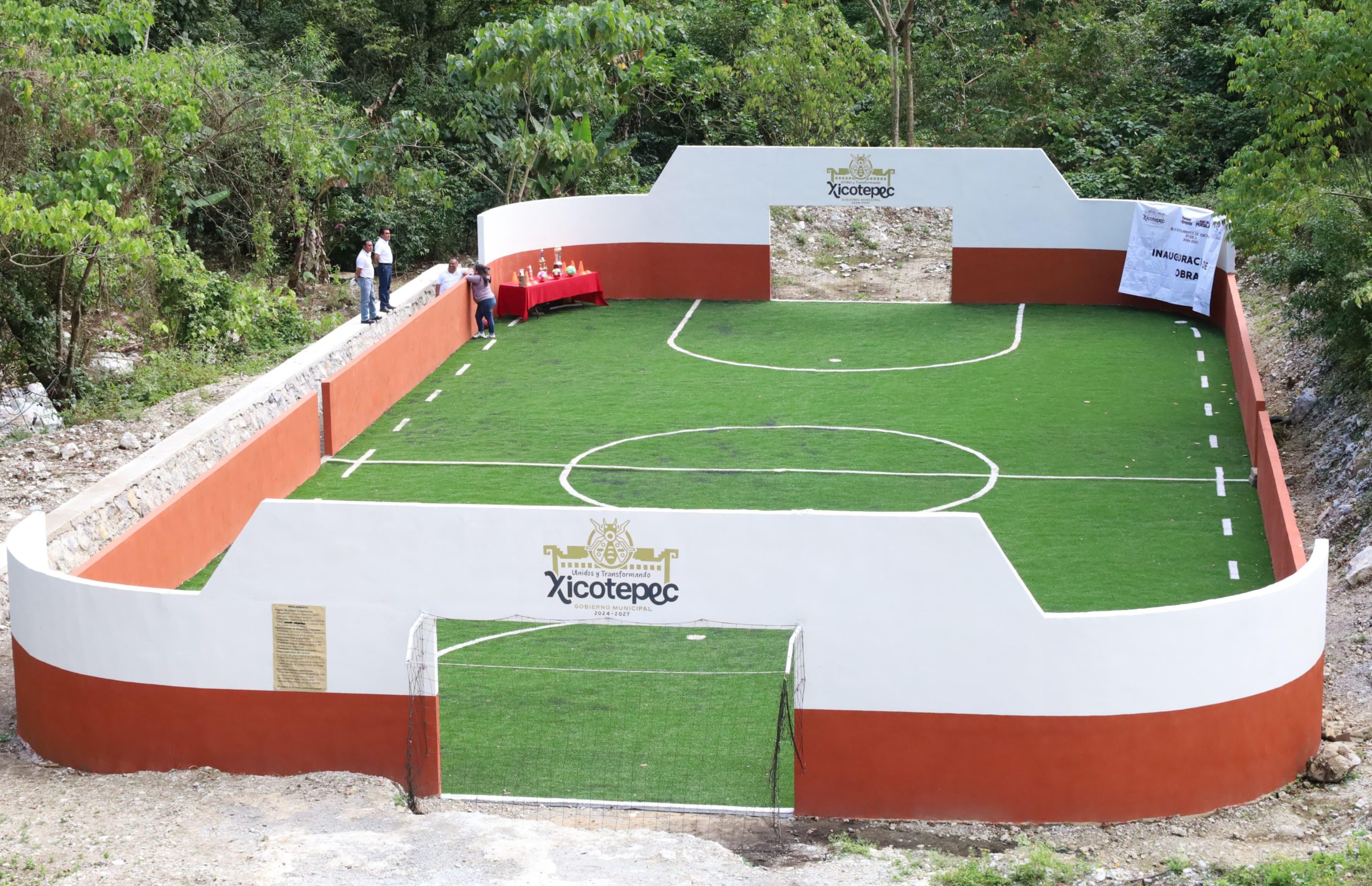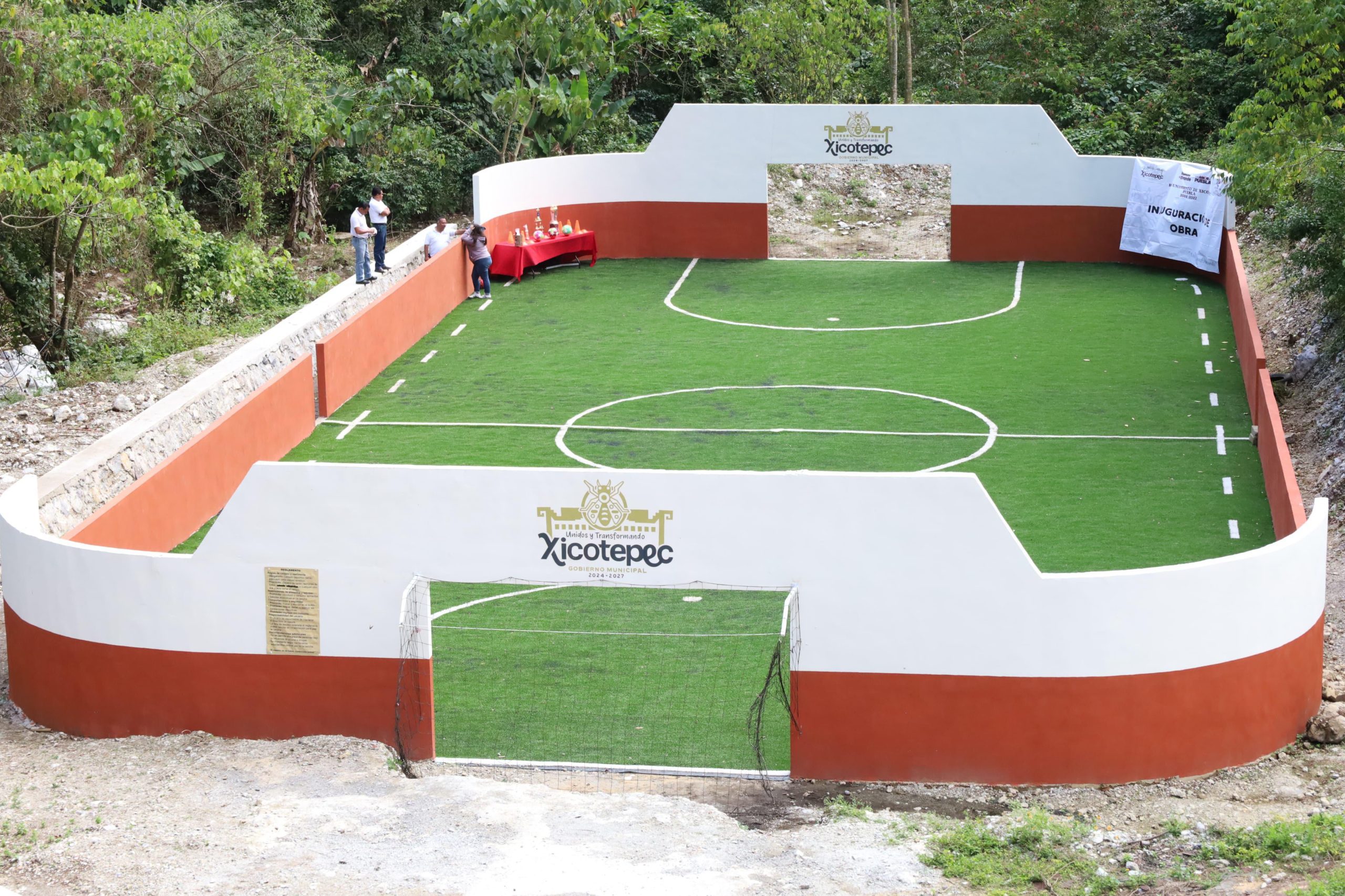 La cancha incluye porterías y pasto sintético, muro de contención, limpieza, trazado, excavaciones, balastre, compactación de terreno y muretes.