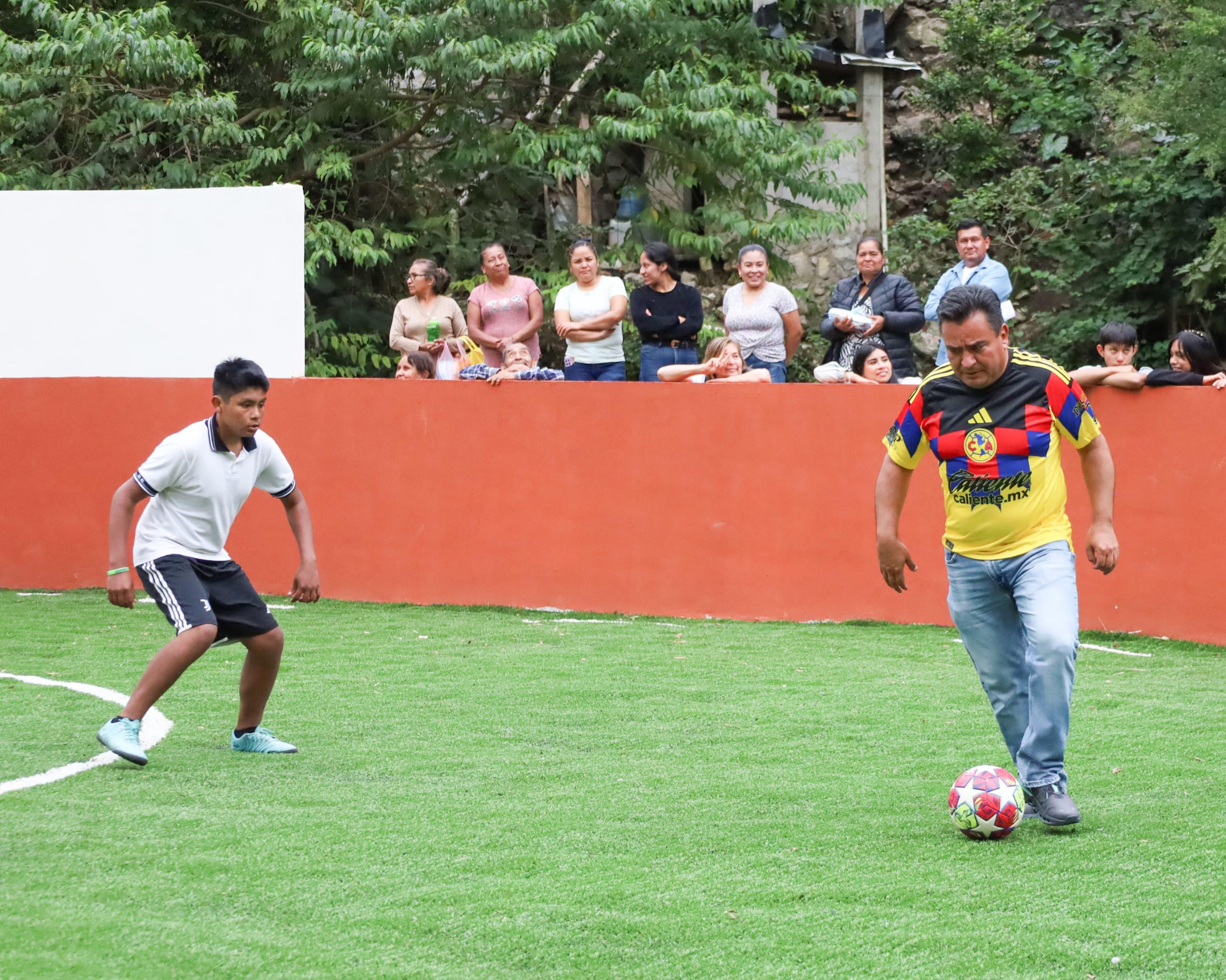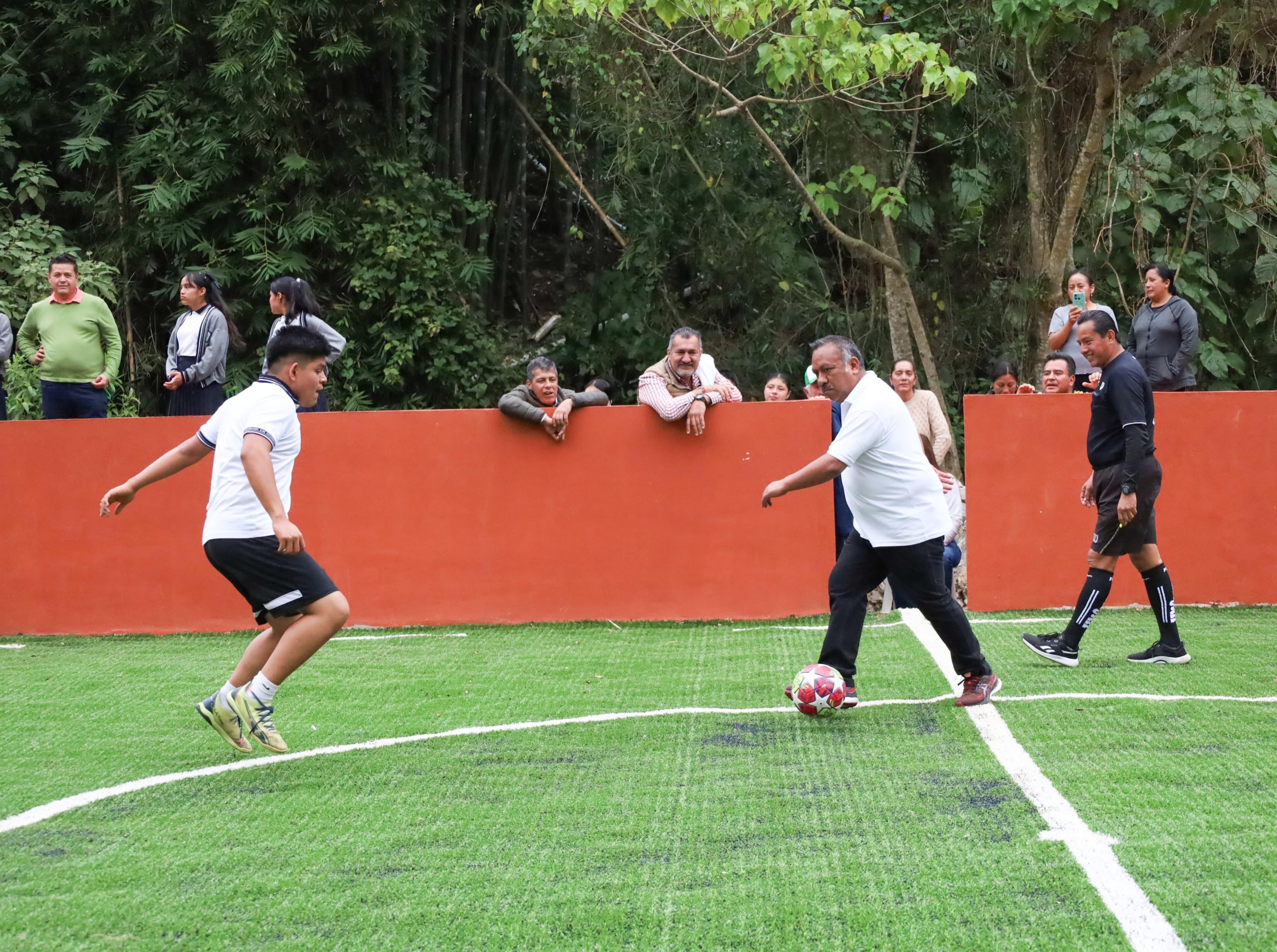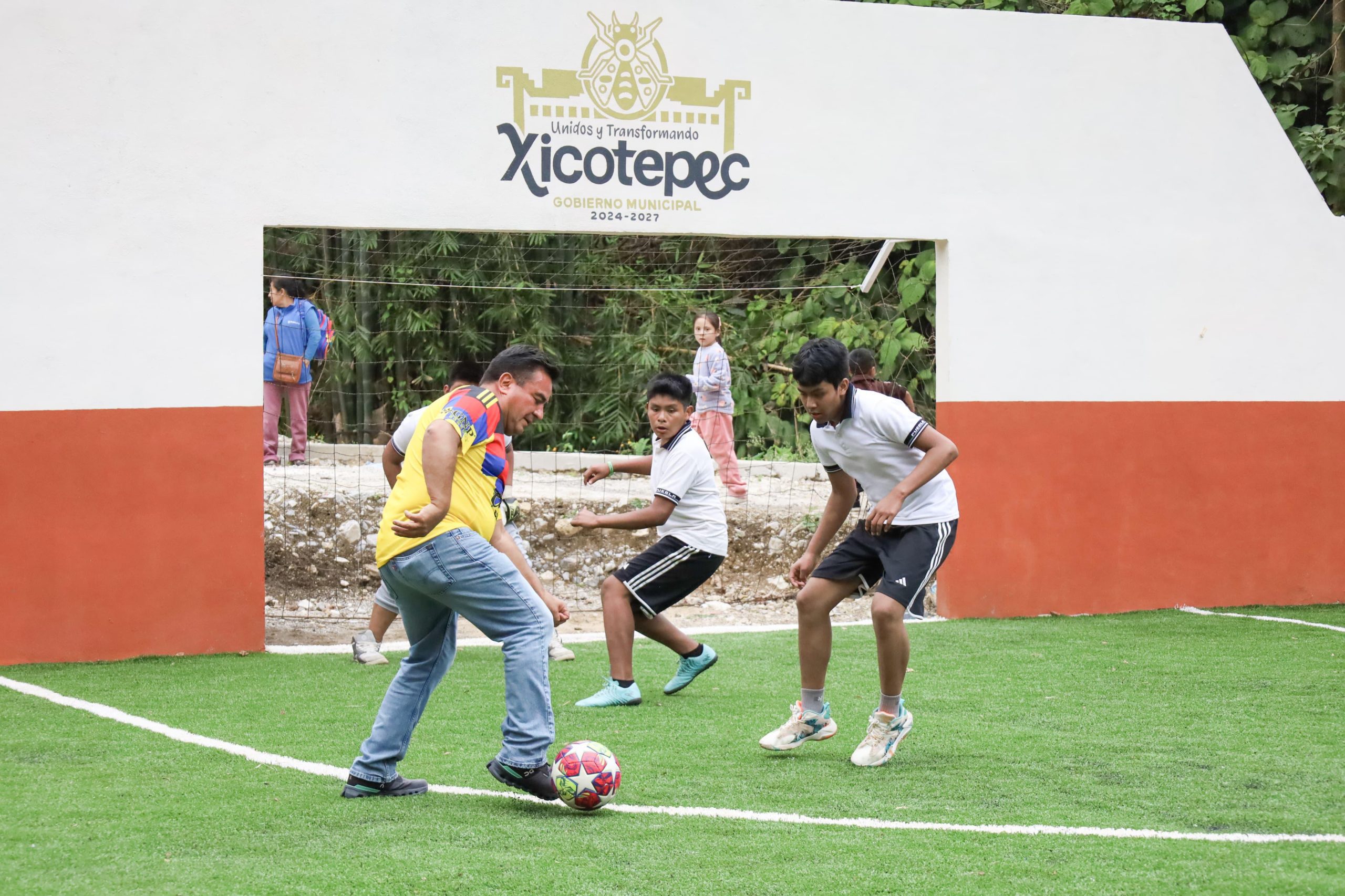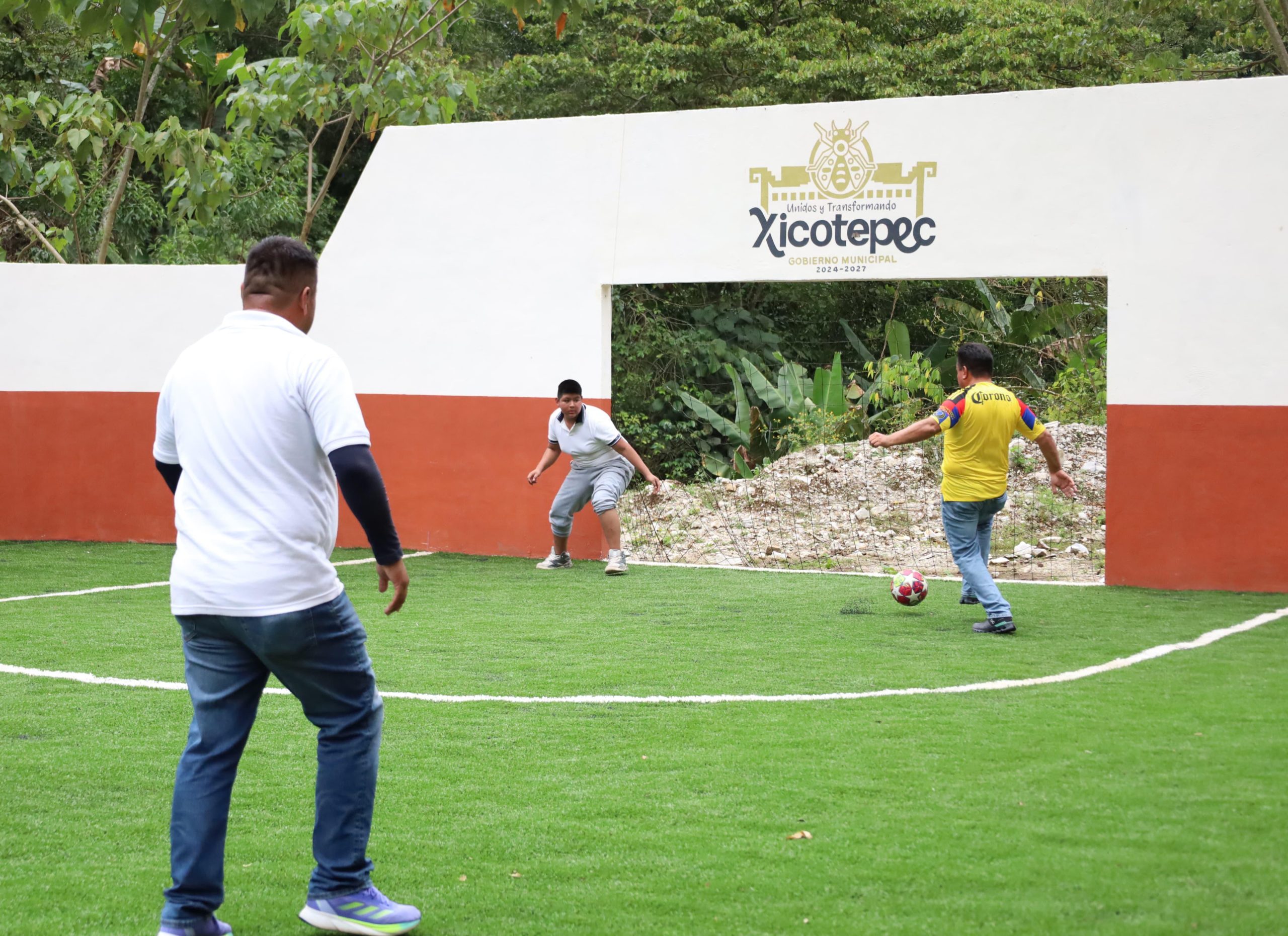 La cancha incluye porterías y pasto sintético, muro de contención, limpieza, trazado, excavaciones, balastre, compactación de terreno y muretes.